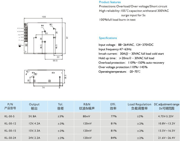 高可靠性:105C長(zhǎng)壽命電容,能承受300VAC輸入電壓5秒不損壞 100滿載老化測(cè)試 輸入電壓:88-264VAC124-370VDC 輸入頻率:47~63Hz 沖擊電流:30A@-30VAC滿載冷態(tài) 保持時(shí)間:≥20ms@230VAC滿載 過(guò)載保護(hù):110%-150%自動(dòng)恢復(fù) 過(guò)壓保護(hù):110%~145% 運(yùn)行溫度:-20-70℃" />