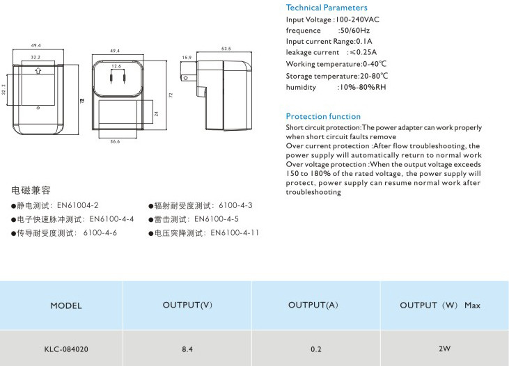 頻率:50/60Hz 輸入電流:0.1A 漏電電流:≤0.25A 工作溫度:0-40℃ 貯藏溫度:-20-80℃ 濕度:10%-80%RH 短路保護(hù): 電源適配器在短路解除時(shí)能正常工作恢復(fù) 過(guò)流保護(hù):過(guò)流故障排除后,電源將自動(dòng)恢復(fù)正常工作 過(guò)壓保護(hù):當(dāng)輸出電壓超過(guò)額定電壓的150-180%時(shí),電源將保護(hù),故障排除后電源能恢復(fù)正常工作" />
