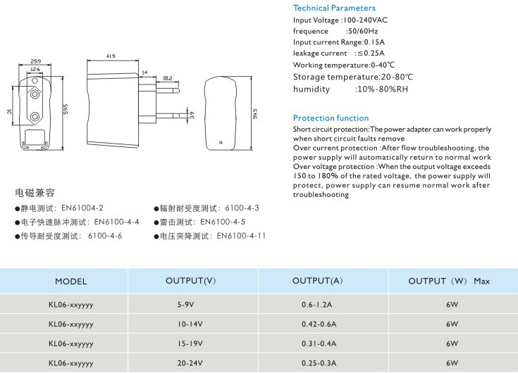 頻率:50/60Hz 輸入電流:0.15A 漏電電流:≤0.25A 工作溫度:0-40℃ 貯藏溫度:-20-80℃ 濕度:10%-80%RH 短路保護: 電源適配器在短路解除時能正常工作恢復 過流保護:過流故障排除后,電源將自動恢復正常工作 過壓保護:當輸出電壓超過額定電壓的150-180%時,電源將保護,故障排除后電源能恢復正常工作" />