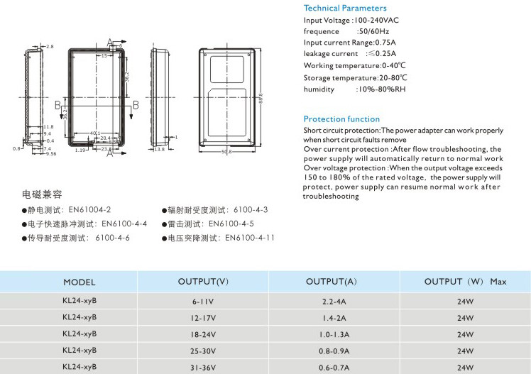 過流保護(hù):過流故障排除后,電源將自動恢復(fù)正常工作 過壓保護(hù):當(dāng)輸出電壓超過額定電壓的150~180%時,電源將保護(hù),故障排除后電源能恢復(fù)正常工作 輸入電壓:100-240VAC 頻率:50/60Hz 輸入電流:0.75A 漏電電流:<0.25A 工作溫度:0-40℃ 貯藏溫度:-20-80℃ 濕度:10%-80%RH" />